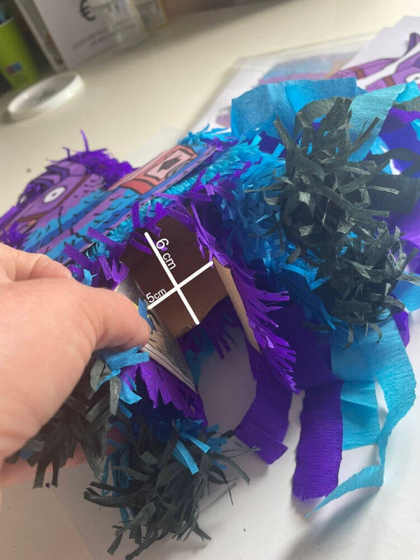 De piñata is 28h x 18b x6 cm breed en is voorzien van een touw om de piñata op te hangen. De piñata is gemaakt van ongeveer drie lagen papier-maché met behanglijm en oude kranten. Er zit een handige opening van 6 x 5 cm onderaan de piñata zodat je de confetti, slingers, felicitatie briefjes, snoep of een cadeau in kunt doen.